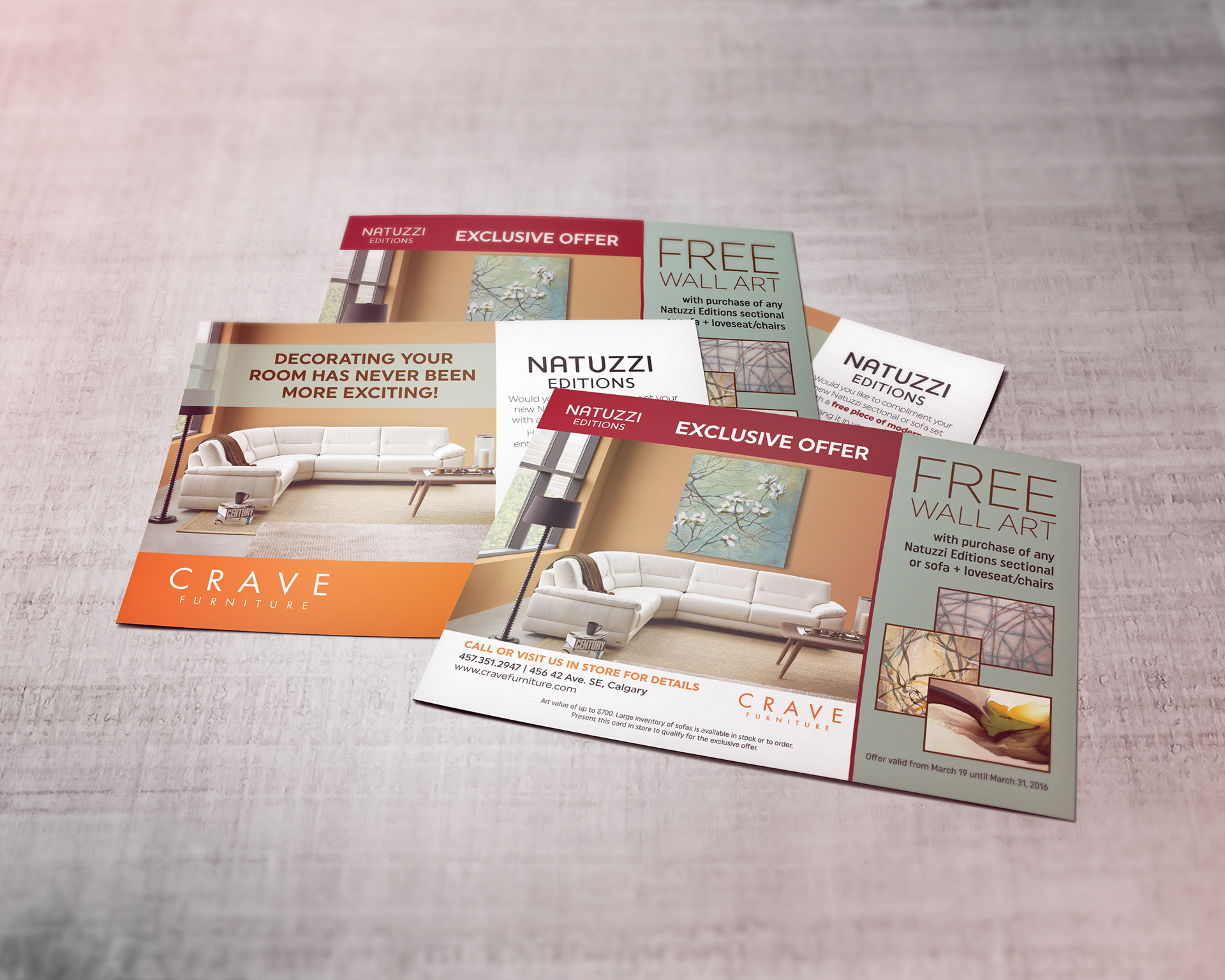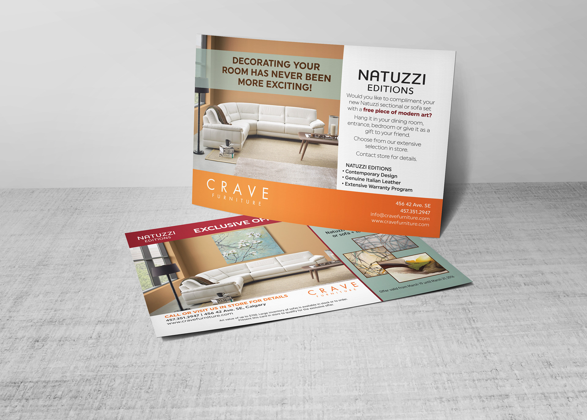 Local furniture company Crave Furniture hired me to create a double-sided post card, promoting a free wall art gift with the purchase of Natuzzi Editions furniture. This postcard was distributed through Canada Post's targeted delivery service to specific areas of the city of Calgary. The design had to meet CP's size and technical specs.