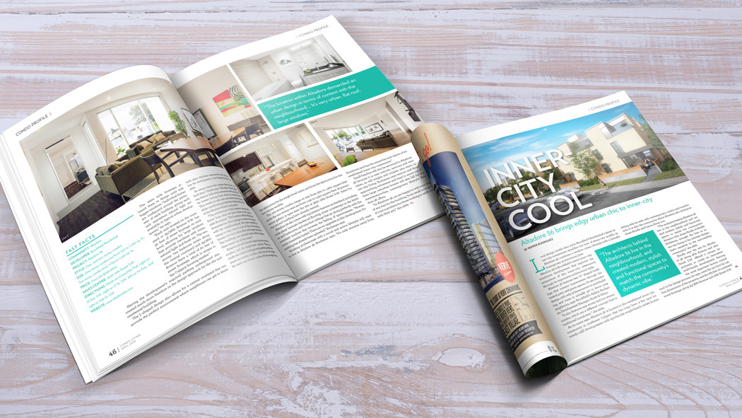 A three-page editorial layout, profiling the Altadore 36 condo building in Calgary. Using large photos of the condo unit to pull readers in and show off the modern style of the units. Pull quotes were selected that provided insight and further interest in the article to continue drawing in readers.