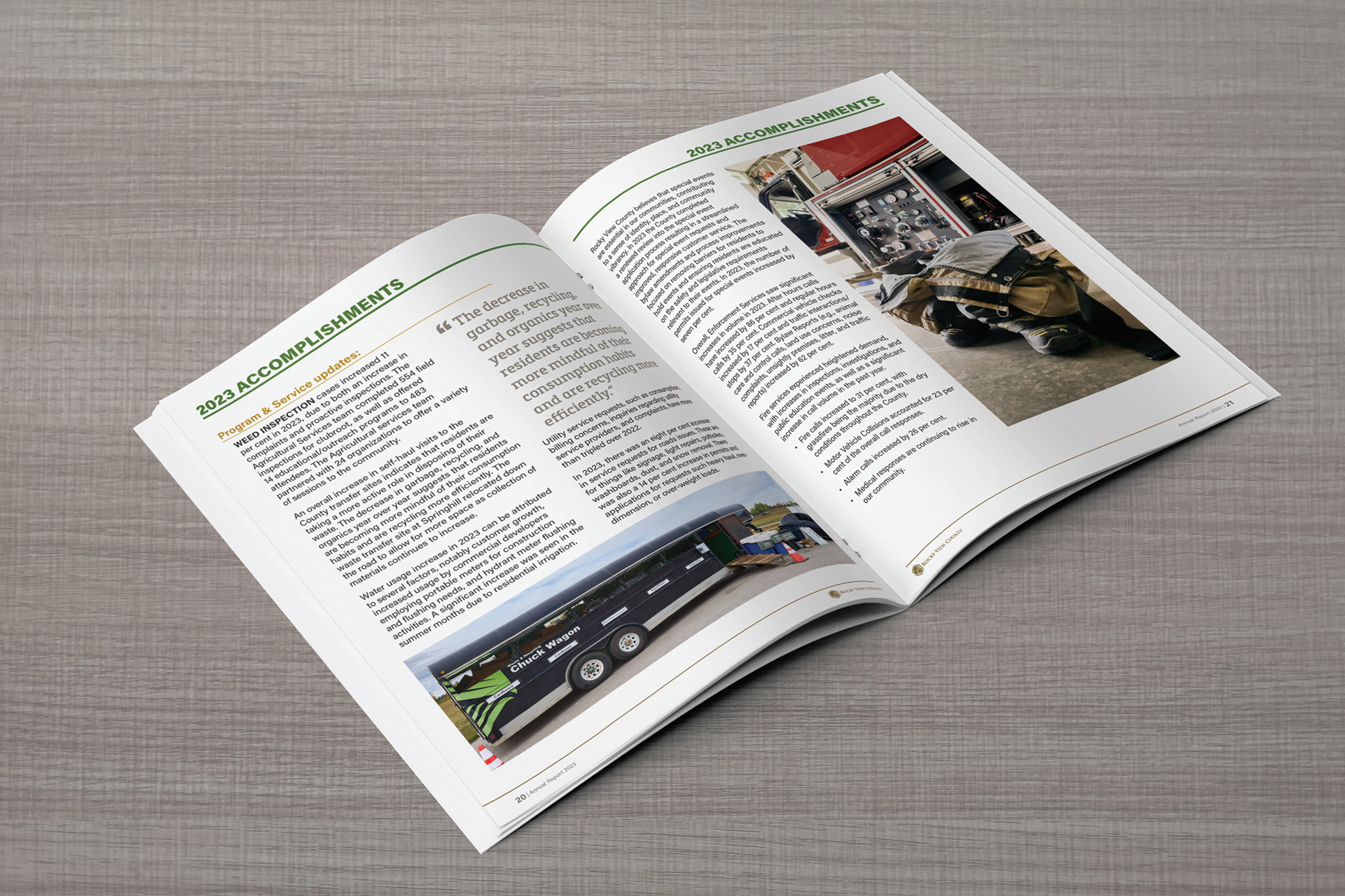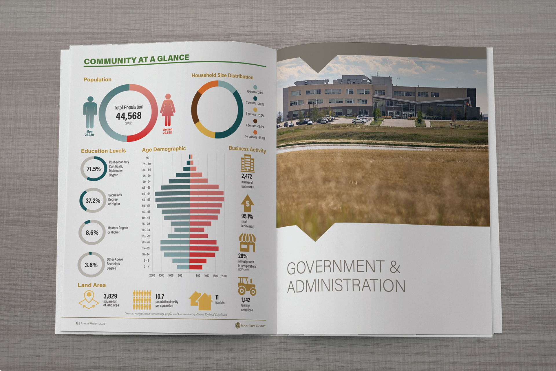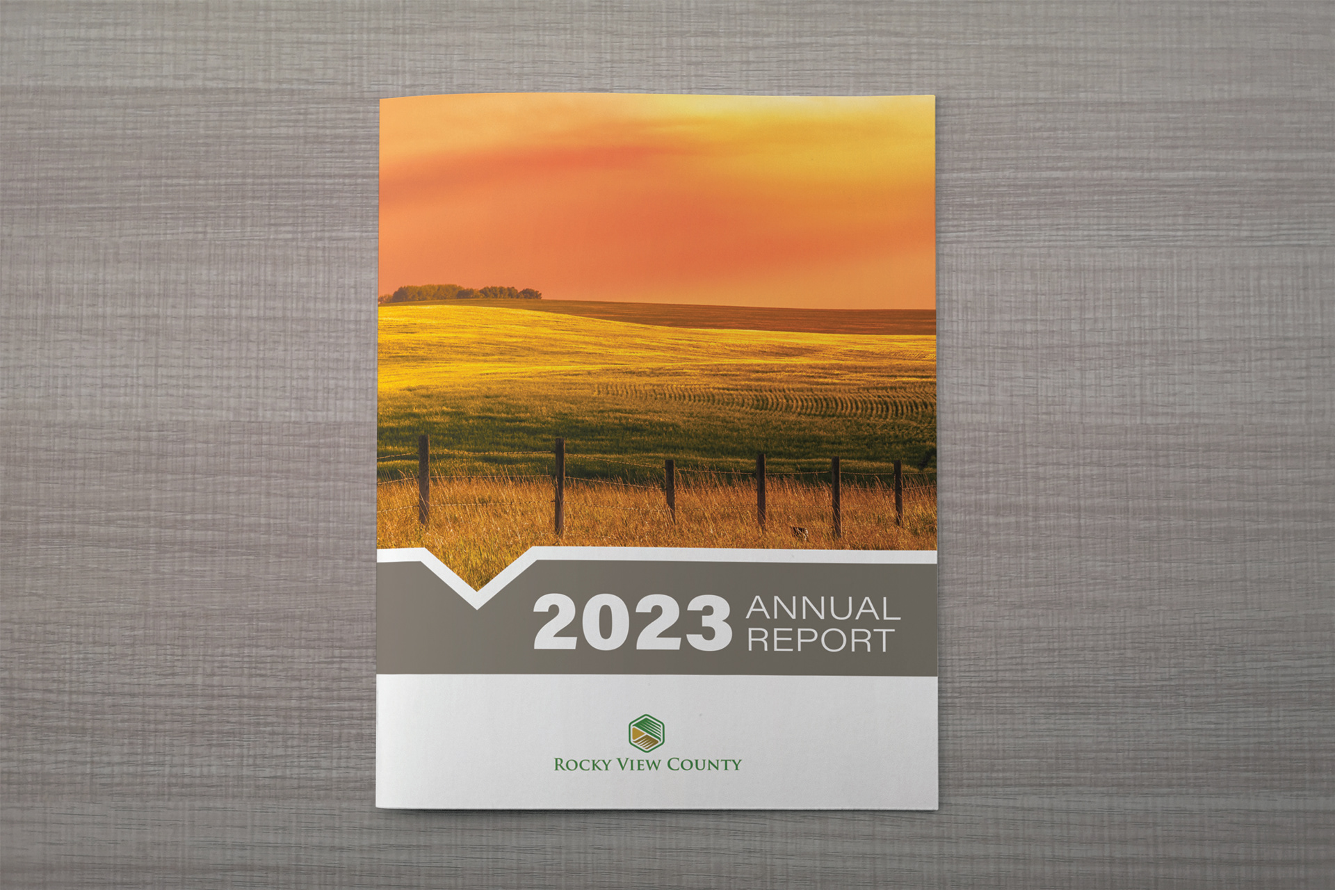As part of my regular duties at Rocky View County, I laid out the County’s 2023 Annual Report, a 64-page publication summarizing the County’s achievements, community highlights, and financial results. I was responsible for designing the cover and the full front half of the book, using content supplied by the Communications & Engagement team and following the County brand guidelines.